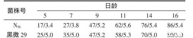 由表5可以得出,N56號菌株在PDA培養皿上菌落擴展速度與黑微29號菌株相比,初期菌落擴展速度較慢,說明生長較慢,14 d后,在PDA培養皿上菌落擴展速度迅速加快,達到5.4 mm/d,說明生長急速加速,超過了對照株(5.0 mm/d)在PDA培養皿上菌落擴展速度。