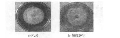采用平板觀察法。平皿上的菌落生長12 d后,菌絲呈放射狀延伸,菌絲密度較大,白色無色素,各平行培養的N56號菌株表現均相同。黑微29號稍有色素,較密,邊緣菌絲放射狀延伸。N56號與黑微29菌株的菌落形狀如圖1所示。