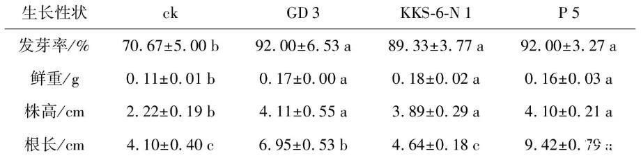 將辣椒種子置于3%次氯酸鈉溶液中進行表面消毒10 min,用蒸餾水反復清洗多次后,處理組的辣椒種子分別置于OD600值為1.0的3種菌液中浸種2 h,未處理組對照種子則置于LB培養基中;浸種完成后用無菌濾紙略微蘸干表面液體、置于鋪有被無菌水潤濕的無菌濾紙的培養皿中,于30℃恒溫培養箱中放置15 d,期間保持濾紙濕潤,統計辣椒種子的發芽率;之后移栽于裝有300 g土壤的育苗盆中進行盆栽試驗,整個試驗期間保持土壤濕潤,30 d后收獲測定植株生長指標。試驗設對照組、GD 3處理組、KKS-6-N 1處理組和P 5處理組,每組為25粒種子,重復3次;盆栽試驗時每組6株幼苗,重復3次。