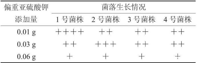 按照上述步驟配制不同含量SO2的YPD固體培養基,經滅菌倒平板,待凝固后分別在不同SO2含量的平板上接種1號、2號、3號、4號菌株,倒置放入28℃恒溫箱培養72 h,觀察菌落數。