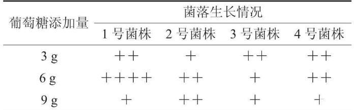 按照上述步驟配制不同糖濃度的YPD固體培養基,經滅菌倒平板,待凝固后分別在含糖量不同的平板上接種1號、2號、3號、4號菌株,倒置放入28℃恒溫箱培養72 h,觀察菌落數。
