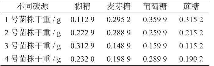 按照上述步驟配制含不同類型碳源的YEPD液體培養基,經滅菌冷卻后分別按5%接種量,接入1號菌、2號菌、3號菌、4號菌,放入28℃、轉速180 r/min搖床中震蕩培養72 h,取培養液裝于50 mL離心管中以10 000 r/min離心10 min,收集酵母細胞,用無菌水洗滌3次,烘干后稱干重。