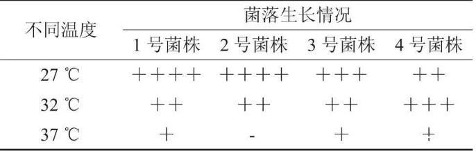 按照上述步驟配制YPD固體基礎培養基,經滅菌倒平板,待凝固后分別在平板上接種1號、2號、3號、4號菌株,倒置放入27℃、32℃、37℃的不同恒溫箱培養72 h,觀察菌落數。