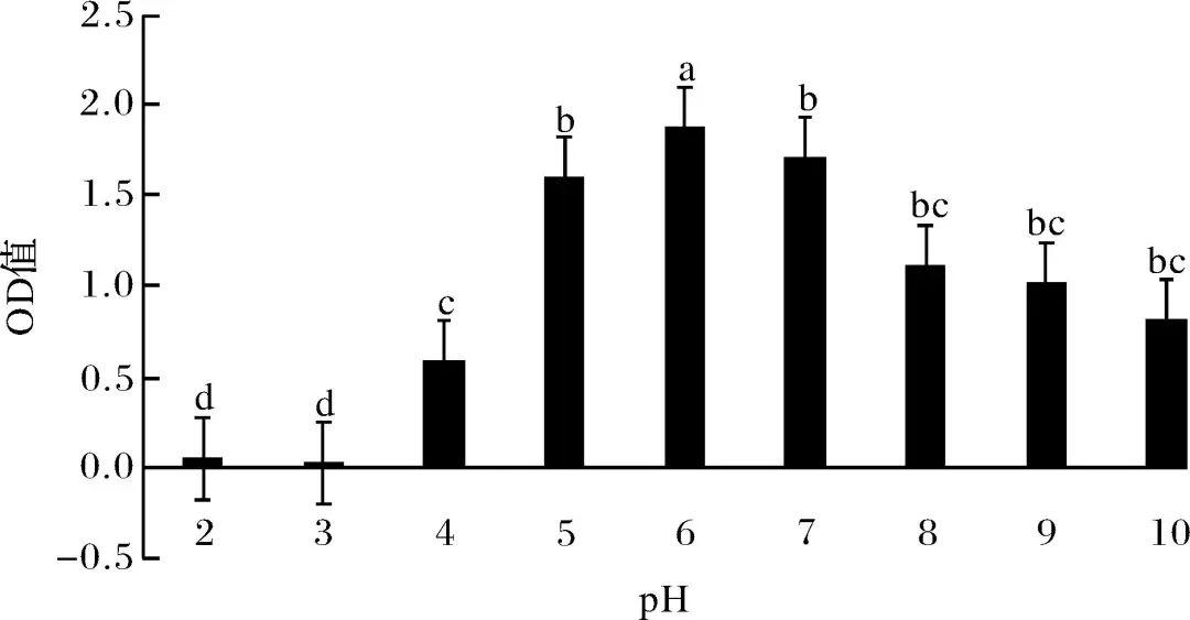 由圖3可知,pH 2~3的環境中該菌幾乎不生長,pH=4時增長較為顯著,此時該菌增長緩慢;在堿性環境中(pH=8、9、10)該菌OD值呈下降趨勢,pH=6時該菌長勢最好,為該菌最適生長的pH環境。