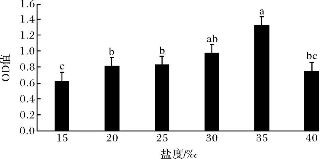 由圖2可知,在15‰與40‰的鹽度下、20‰~30‰鹽度環境下該菌增長變化差異不顯著,35‰鹽度環境下較15‰、20‰、25‰和40‰組增長差異顯著,為最適的增長鹽度。