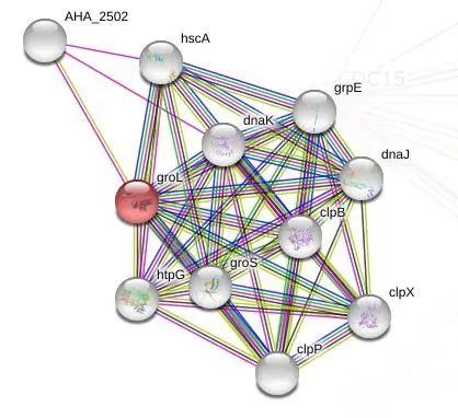 通過ExPASy-ProtParam tool分析工具進行分析,該蛋白氨基酸數為544,分子質量為57 194.87,理論pI為4.87。其帶負電荷的殘基總數(Asp+Glu)為80,該蛋白為穩定蛋白,其不穩定指數為29.31,帶正電荷的殘基總數(Arg+Lys)為62;脂肪指數為98.29,親水性總平均值(GRAVY)為0.014。通過STRING數據庫預測其與相關蛋白的相互關聯,圖6是證據視圖,蛋白質CH60_AERHH在圖中顯示為groL。