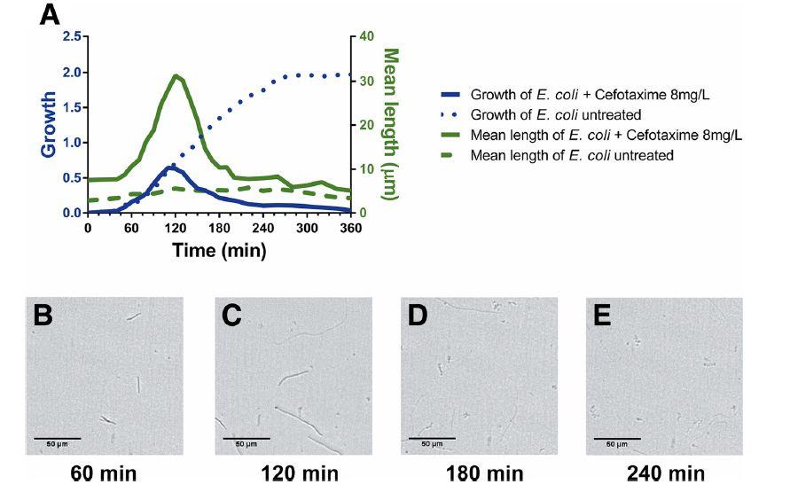 圖2、哌拉西林對(duì)oCelloScope系統(tǒng)獲得的大腸桿菌生長和長度的影響。a)采用兩種不同的算法對(duì)未經(jīng)處理(點(diǎn)線)和頭孢噻肟處理(實(shí)線)的大腸桿菌進(jìn)行細(xì)菌生長動(dòng)力學(xué)和成絲的定量測定:生長動(dòng)力學(xué)(藍(lán)色圖)是基于分割和提取表面積測量的,細(xì)菌長度(綠色圖)是基于分割提取的平均長度測量的。8 mg/L頭孢噻肟處理后,oCelloScope系統(tǒng)分別在(b)60 min、(c)120 min、(d)180 min和(e)240 min時(shí)獲得大腸桿菌的形態(tài)學(xué)圖像。