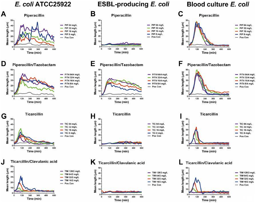 圖5、β-內(nèi)酰胺-β-內(nèi)酰胺酶抑制劑組合對(duì)大腸桿菌細(xì)菌長度的影響。對(duì)照菌株大腸桿菌、產(chǎn)esbl大腸桿菌和血培養(yǎng)大腸桿菌分別用4種不同濃度的哌拉西林單獨(dú)(a-c)或補(bǔ)充他唑巴坦(d-f)和噻卡西林單獨(dú)(g-i)或補(bǔ)充克拉維酸(j-1)處理。每15 min重復(fù)測量細(xì)菌長度,持續(xù)10 h。