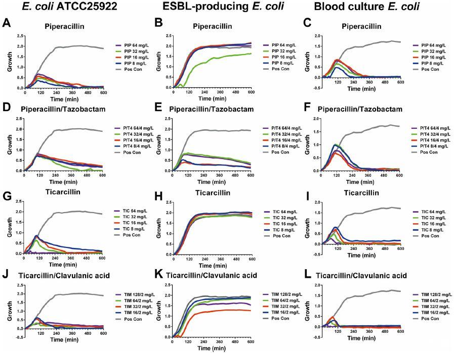 圖4、β-內(nèi)酰胺-β-內(nèi)酰胺酶抑制劑組合對(duì)大腸桿菌生長動(dòng)力學(xué)的影響。對(duì)照菌株大腸桿菌、產(chǎn)esbl大腸桿菌和血培養(yǎng)大腸桿菌分別用4種不同濃度的哌拉西林單獨(dú)(a-c)或補(bǔ)充他唑巴坦(d-f)和噻卡西林單獨(dú)(g-i)或補(bǔ)充克拉維酸(j-1)處理。每隔15 min重復(fù)測定生長動(dòng)力學(xué),持續(xù)10 h。