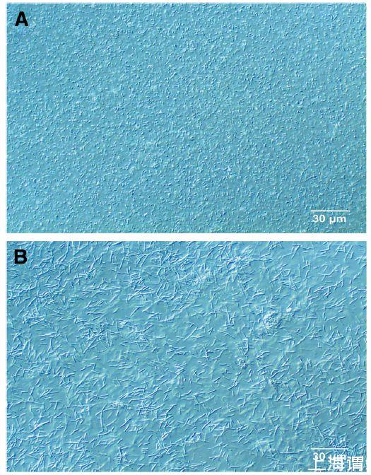 圖1、光鏡下抗生素誘導(dǎo)大腸桿菌成絲。頭孢噻肟(8mg/L)處理后的大腸桿菌ATCC259222的抗生素誘導(dǎo)成絲,光鏡下10倍(a)和100倍(b)放大。