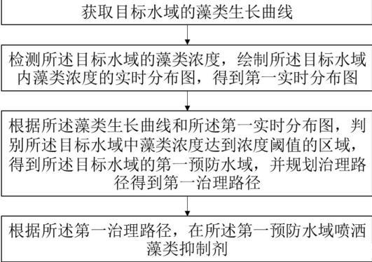 S600:根據(jù)所述藻類生長曲線和所述第二實時分布圖,判別所述目標水域中藻類濃度達到濃度閾值的區(qū)域,得到所述目標水域的第二預防水域,并規(guī)劃治理路徑得到第二治理路徑;S700:根據(jù)所述第二治理路徑,在所述第二預防水域噴灑藻類抑制劑。