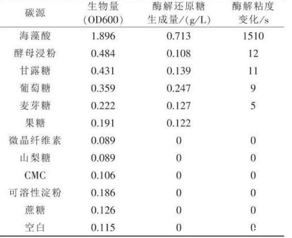 1.2.1不同碳源對生長和產酶的影響在基礎培養基的基礎上調整碳源,即分別添加濃度均為0.6%的葡萄糖、麥芽糖、蔗糖、可溶性淀粉、海藻酸、微晶纖維素、果糖、甘露糖和山梨糖,配制含有不同含碳化合物的培養基。然后按3%的接種量接入菌液,于30℃液體培養16 h后,測定發酵液的生物量和上清液的酶活力。