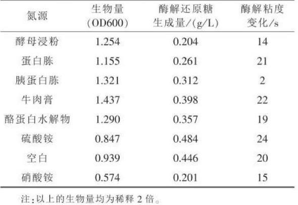 不同氮源對AGN12菌生長及產酶的影響見表2。