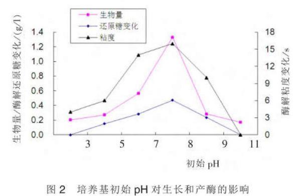 將培養基的初始pH調整為3.0,5.0,7.0,8.0,9.0,11.0,初始pH值對生長和產酶的影響見圖2。