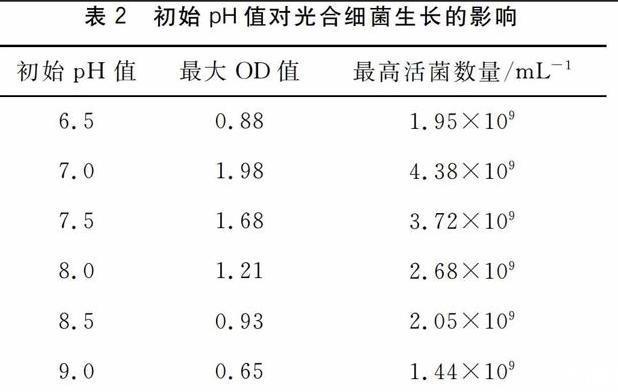 從表2得知,光合細(xì)菌在pH值6.5~9.0范圍內(nèi)均能良好生長,但不同的初始pH值對光合細(xì)菌生長產(chǎn)生不同影響。從測定的數(shù)據(jù)可以看出,各組之間,OD值、活菌數(shù)量差異明顯。初始pH 7.0時生長最好,OD值達(dá)1.98、最高活菌數(shù)量達(dá)4.38×109個/mL,其次是pH 7.5。最差是pH 9.0,OD值為0.65、最高活菌數(shù)量1.44×109個/mL。由于光合細(xì)菌的代謝產(chǎn)物為堿性,隨著培養(yǎng)時間的遞增,各組pH呈現(xiàn)不斷上升的趨勢,光合細(xì)菌活菌數(shù)量也不斷增加。因此,在培養(yǎng)過程中,必須隨時測定和調(diào)整pH值,pH值過高或過低對光合細(xì)菌的生長都不利。為了延長光合細(xì)菌的對數(shù)生長期,當(dāng)pH值上升超出最適范圍時,可以采用加1 mol/L的醋酸溶液調(diào)整菌液pH值。