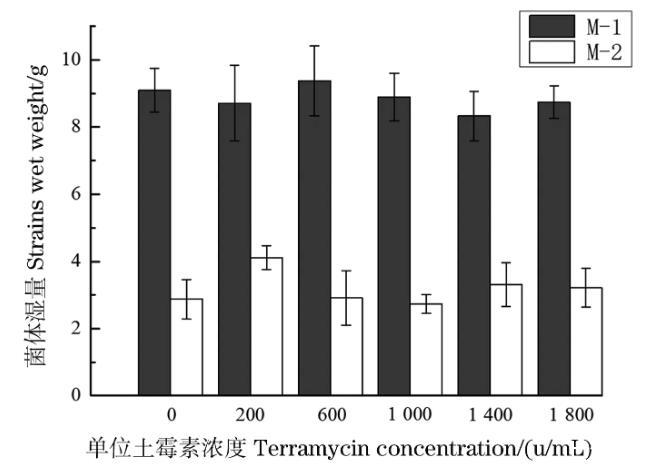 配制含有土霉素0、200、600、1 000、1 400和1 800 u/mL,pH 3的察氏液體培養基各100 mL,分別加入250 mL錐形瓶中。吸取1 mL的M-1、M-2的孢子懸液接入不同土霉素含量的察氏液體培養基中,在30℃,160 r/min條件下培養6 d。用5 000 r/min離心10 min,獲得濕菌絲,稱重,分析并比較土霉素對菌體生長的影響,考察其土霉素耐受性。