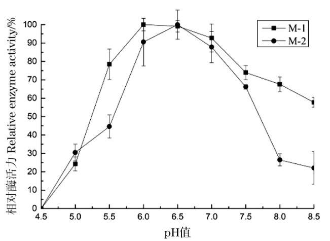 向100 mL/250 mL察氏培養基中,分別接入1 mL M-1、M-2孢子懸液,初始pH值分別設定為5.5、6、6.5、7、7.5、8、8.5,平行3組,在30℃,轉速為160 r/min條件下培養168 h,分別取樣測定酶活,考察pH值變化對產酶活性的影響,結果如圖5。