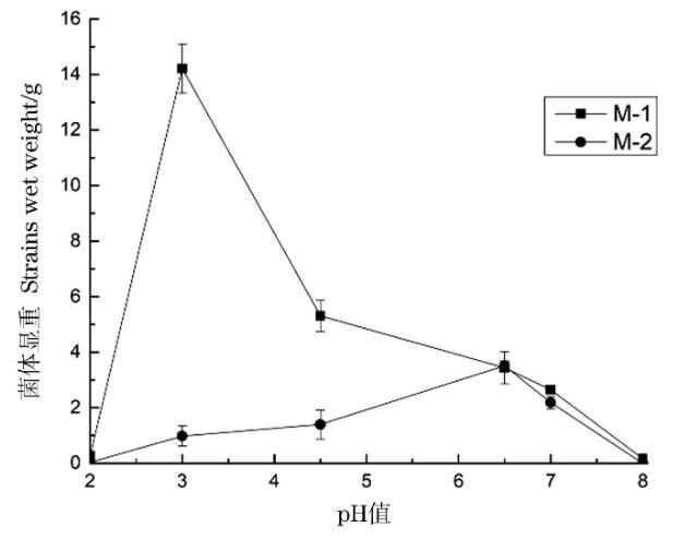 分別配制pH值為2、3、4.5、6.5、7、8的100 mL/250 mL察氏培養基。分別接入1 mL的M-1、M-2的孢子懸液,每個梯度平行做3組,在30℃,160 r/min條件下培養6 d。5 000 r/min離心10 min,稱量菌絲濕重,考察菌株的土霉素耐受性。