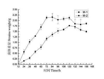 將篩選菌株接種到液體察氏培養基中,培養一定時間后分別取樣測定菌絲濕重,以菌絲濕重值為縱坐標,培養時間為橫坐標,繪制生長曲線。由圖2可見,培養開始24 h后,兩種菌株的菌絲重量均急劇上升,此時菌種進入快速增長期。在72 h時,菌株M-1到達增長高點,隨后菌絲濕重無明顯變化,進入緩慢衰亡期;而菌株M-2在108 h時菌絲濕重達增長高點,隨后進入衰亡期。