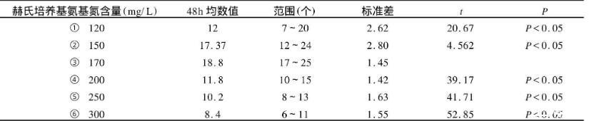 表2赫氏培養(yǎng)基不同氨基氮含量對強毒菌141生長影響的觀察