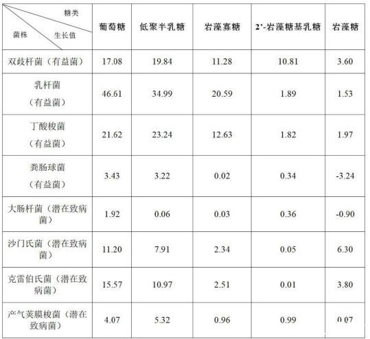 益生元的種類很多,如低聚半乳糖,低聚果糖,菊粉,低聚木糖,2’-巖藻糖基乳糖等。目前使用一種代表性的益生菌和一種代表性的腸道菌,以同時促進有益菌和致病菌的葡萄糖作為陽性對照,按照如下公式進行檢測計算:和代表培養24h和0h時有益菌在益生元上培養的活菌落形成單位(CFU)/mL,和代表培養24h和0h時有益菌在葡萄糖上培養的活菌落形成單位(CFU)/mL,和代表培養24h和0h時腸道菌在益生元上培養的活菌落形成單位(CFU)/mL,和代表培養24h和0h時腸道菌在葡萄糖上培養的活菌落形成單位(CFU)/mL。評分的設計要求益生元促進有益菌生長,而不支持致病菌生長,以體現益生元定義中的“選擇性”。