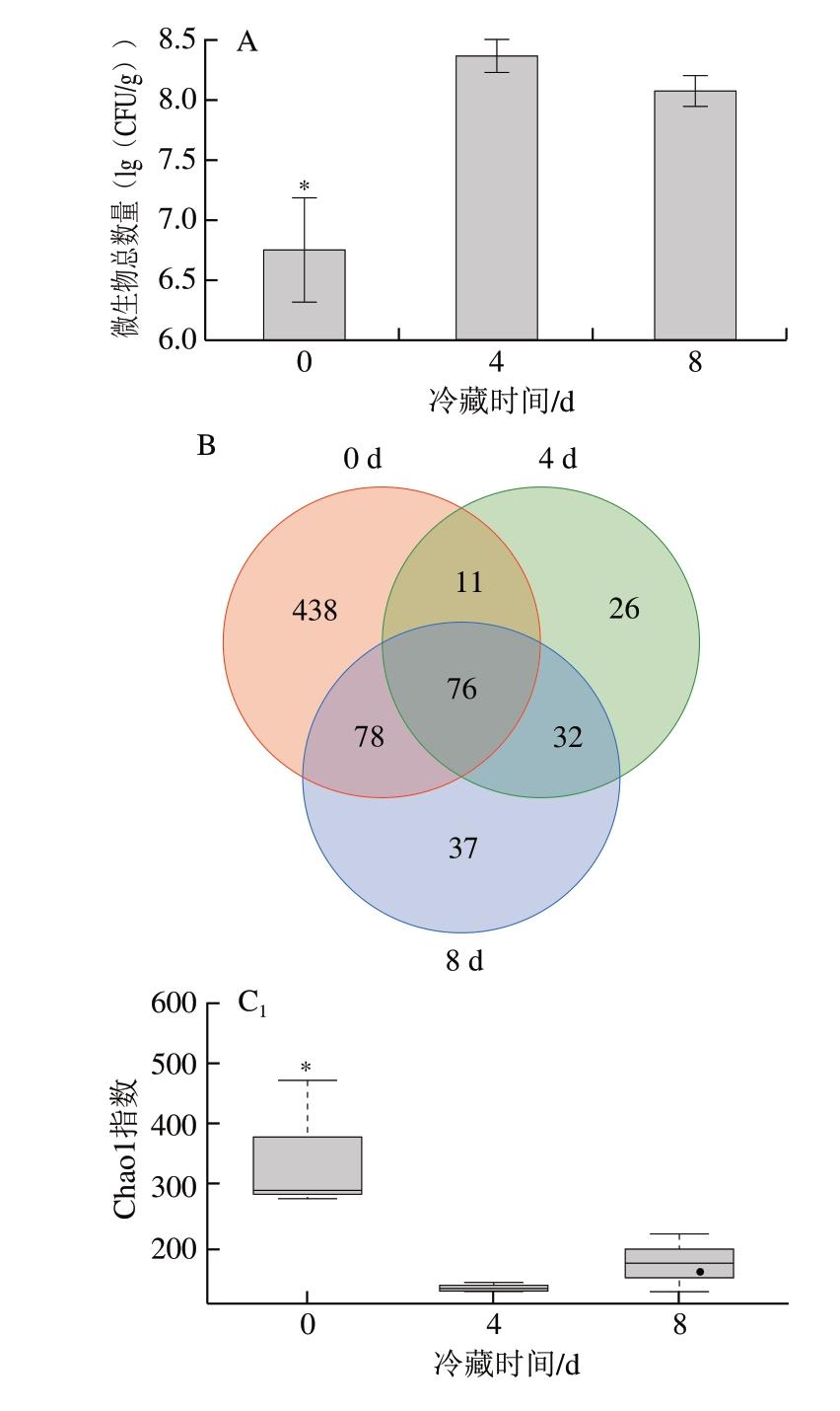 由圖1A可知,革胡子鯰魚肉樣初始微生物總數量為6.75(lg(CFU/g)),冷藏4 d升至8.37(lg(CFU/g)),8 d為8.08(lg(CFU/g))。由圖1B可知,冷藏0、4、8 d共有OTU有76個,冷藏初始特有OTU數量最多,為438個,冷藏4、8 d特有OTU分別為26、37個。由圖1C可知,革胡子鯰魚肉微生物α多樣性在冷藏4、8 d顯著低于初始水平。由圖1D可知,主成分分析顯示,革胡子鯰魚肉冷藏0、4、8 d時的微生物群落組成不同,冷藏0 d樣本微生物組成與冷藏4、8 d樣本聚類在不同區域。