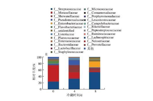 由圖1E可知,革胡子鯰魚肉冷藏0、4、8 d時優勢菌組成不同。冷藏0 d優勢菌為莫拉氏菌科(Moraxellaceae,50.04%)、鏈球菌科(Streptococcaceae,23.79%)、黃桿菌科(Flavobacteriaceae,8.12%)和假單胞菌科(Pseudomonadaceae,3.70%);冷藏4 d優勢菌為鏈球菌科(33.04%)、希瓦氏菌科(Shewanellaceae,21.73%)、莫拉氏菌科(19.90%)、假單胞菌科(15.51%)和李斯特氏菌科(Listeriaceae,5.89%);冷藏8 d為鏈球菌科(53.13%)、腸桿菌科(Enterobacteriaceae)(18.16%)、希瓦氏菌科(8.67%)、莫拉氏菌科(4.00%)、扁球菌科(Planococcaceae,3.36%)和葡萄球菌科(2.03%)。