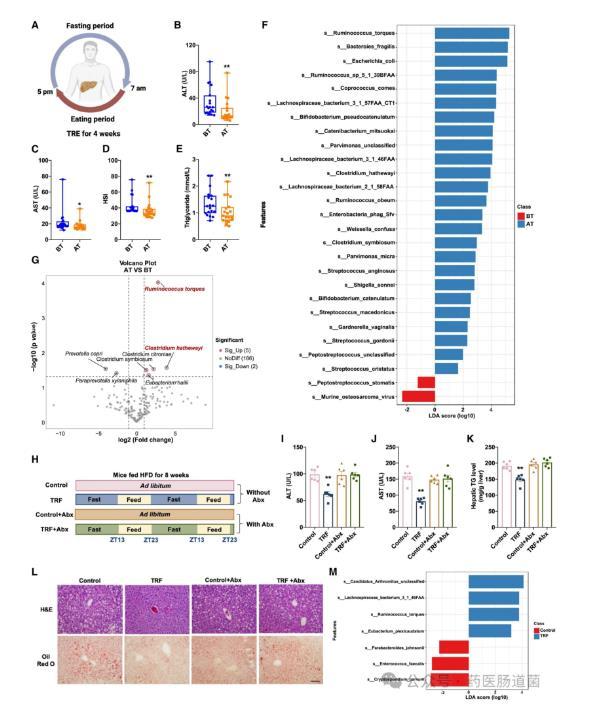 代謝功能障礙相關的脂肪變性肝?。∕ASLD)影響著四分之一的人口,對所有社會都構成了重大的健康和經濟負擔。MASLD包含多種肝臟表現,從肝脂肪變性到更具侵襲性的代謝功能障礙相關脂肪性肝炎(MASH),后者以壞死炎癥和纖維化為特征,可進展為肝硬化和肝細胞癌(HCC)。減緩MASLD的進展,尤其是逆轉已建立的MASH,是臨床治療的重點。鑒于其復雜的病理學和目前缺乏批準的醫療干預措施,積極的飲食和生活方式方法仍然是其管理的主要選擇,但由于依從性差而受到限制。調整飲食攝入量及進餐頻率和飲食時間窗口,已成為改善和延緩疾病發作和衰老的有力工具。限時喂養(TRF)需要在不限制熱量攝入的情況下將每日食物攝入限制在4至12小時的窗口內,被認為是一種有效的飲食和生活方式干預措施,可以改善和推遲疾病的發作。研究表明,TRF可以減輕體重,提高胰島素抵抗,抑制肝脂質積累。然而,導致TRF益處的特定分子機制仍然難以捉摸。腸道菌群的組成是調節宿主代謝的關鍵因素。腸道微生物群的組成和功能容易受到飲食特征的影響,例如脂質的數量和組成。食物過度消費、食物短缺,甚至飲食周期的變化都可能影響腸道菌群。TRF可以部分恢復小鼠高脂飲食(HFD)攝食引起的腸道菌群周期性波動,增加腸道菌群多樣性,影響宿主代謝,表明腸道微生物群可能在TRF的益處中發揮重要作用。微生物代謝物被認為是微生物群與宿主之間通信的關鍵介質,維持宿主的生理功能。