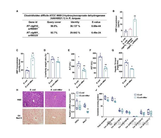 腸道微生物群和微生物代謝物是否有助于TRF對MASLD/MASH的影響仍有待探索。這項研究使用10小時TRF方案作為對MASLD患者和小鼠模型的干預措施,以探索TRF可以改善這種情況的潛在機制。發現10小時TRF后腸道菌群中的瘤胃球菌(R.torques)增加,該物種的定植足以模擬TRF對MASLD/MASH的有益影響。從機制上講,文章發現R.torques通過其微生物代謝產物2-羥基-4-甲基戊酸(HMP)抑制腸道HIF-2α-神經酰胺軸來改善MASLD/MASH。總的來說,這些結果確定了R.torques及其相關代謝物之一HMP在TRF對MASLD/MASH的有益作用中的作用,表明R.torques或HMP可能作為益生菌或作為MASLD/MASH的藥物治療開發。