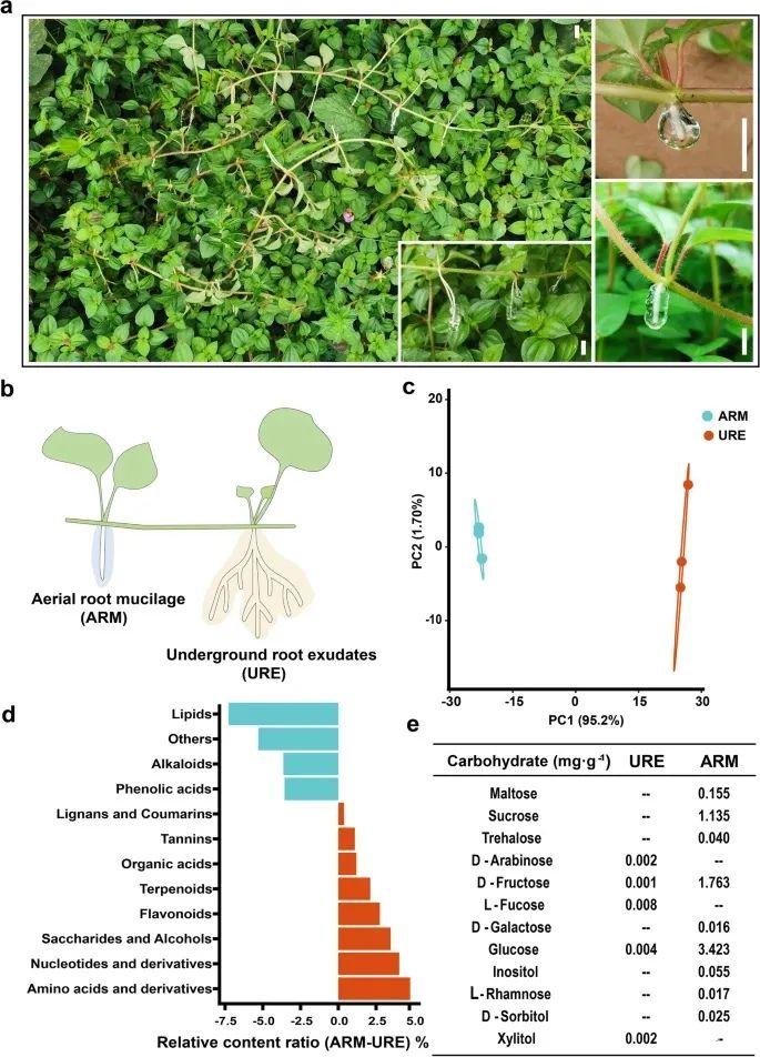 蔓性野牡丹(Heterotis rotundifolia)是一種快速生長的多年生灌木雙子葉植物。它是全球雜草綱要中列出的高風險入侵植物之一。它們的氣生根從0.1到16 cm不等,在到達地面之前會散發出大量的黏液(圖示)。代謝物和微生物組分析表明,氣生根黏液富含碳水化合物和重氮營養細菌。氮同位素標記實驗和基因表達分析表明,氣生根黏液微生物可以固定大氣氮以支持植物生長。雖然氣生根黏液富含營養物質,但沒有觀察到內部富集其他環境和致病微生物。研究人員在黏液中鑒定出一種真菌分離物,該分離物已顯示出廣譜抗菌活性,但允許重氮營養細菌的生長。這種“友好”的真菌可能是維持黏液微生境中固氮功能的關鍵驅動因素。
