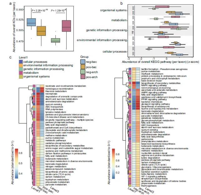 在細菌和古菌中,較小的基因組規模往往與較低的功能基因豐度有關。平均而言,pos-arch組中的類群的KOs和KEGG通路的豐度明顯高于neg-arch組中的類群,而細菌中的情況恰恰相反。只有一個例外,即遺傳信息處理通路在pos-bac組和neg-bac組之間沒有顯著差異。