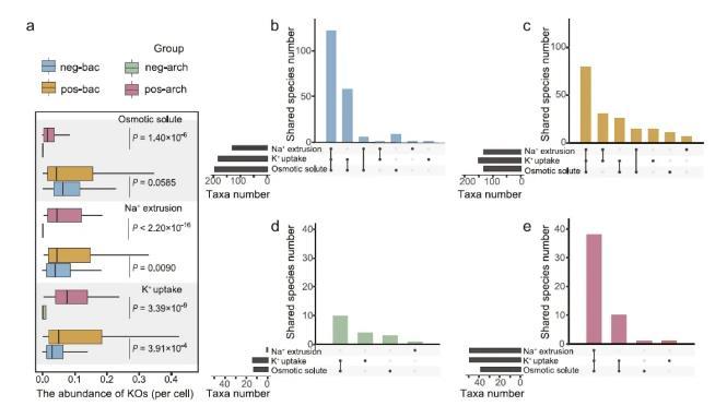 與鹽敏感類群相比,耐鹽細菌和古菌與耐鹽相關的KO的豐度都明顯更高。這證明了分組的準確性。與豐度不同,細菌和古細菌之間的耐鹽機制多樣性也存在很大差異。耐鹽古細菌往往具有全面的耐鹽機制。對于三種最著名的適應性抗鹽機制,76%的耐鹽古細菌(38個類群)擁有這三種抗鹽機制,而只有2%的敏感古細菌(10個類群)擁有這三種機制。細菌類群則呈現出相反的模式。也就是說,pos-bac類群的耐鹽機制多樣性較低。