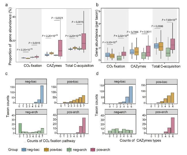 與鹽敏感細菌和古菌相比,耐鹽細菌和古菌往往含有較高比例的C獲取基因。具體來說,pos-bac組的總碳獲取基因和碳降解基因的相對豐度為13.49%,而negative-bac組為12.43%。這種模式在古菌中更為明顯,正古細菌與負古菌的總碳獲取基因比率分別為24.37%與12.65%。pos-arch組和neg-arch組中參與C獲取的基因絕對豐度沒有明顯差異。就古細菌而言,pos-arch組參與C獲取的基因絕對豐度明顯高于負-古細菌。
