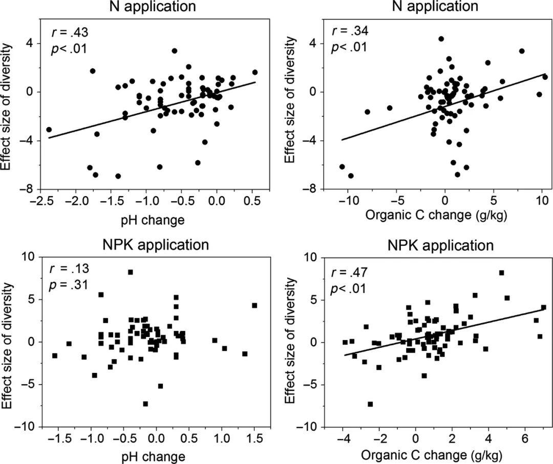 結(jié)果表明,施氮降低了土壤pH值,增加了土壤有機碳(C)和有效氮含量。單施氮肥降低了細(xì)菌多樣性,而施NPK肥增加了細(xì)菌多樣性。施氮對細(xì)菌多樣性的影響因土壤質(zhì)地和水分管理而異,而與作物類型或施氮量無關(guān)。單施氮肥時細(xì)菌多樣性的變化與土壤pH值和有機碳含量呈正相關(guān)關(guān)系,而施NPK肥時僅與土壤有機碳含量呈正相關(guān)關(guān)系。長期施氮條件下,微生物生物量碳隨細(xì)菌多樣性的降低而降低。