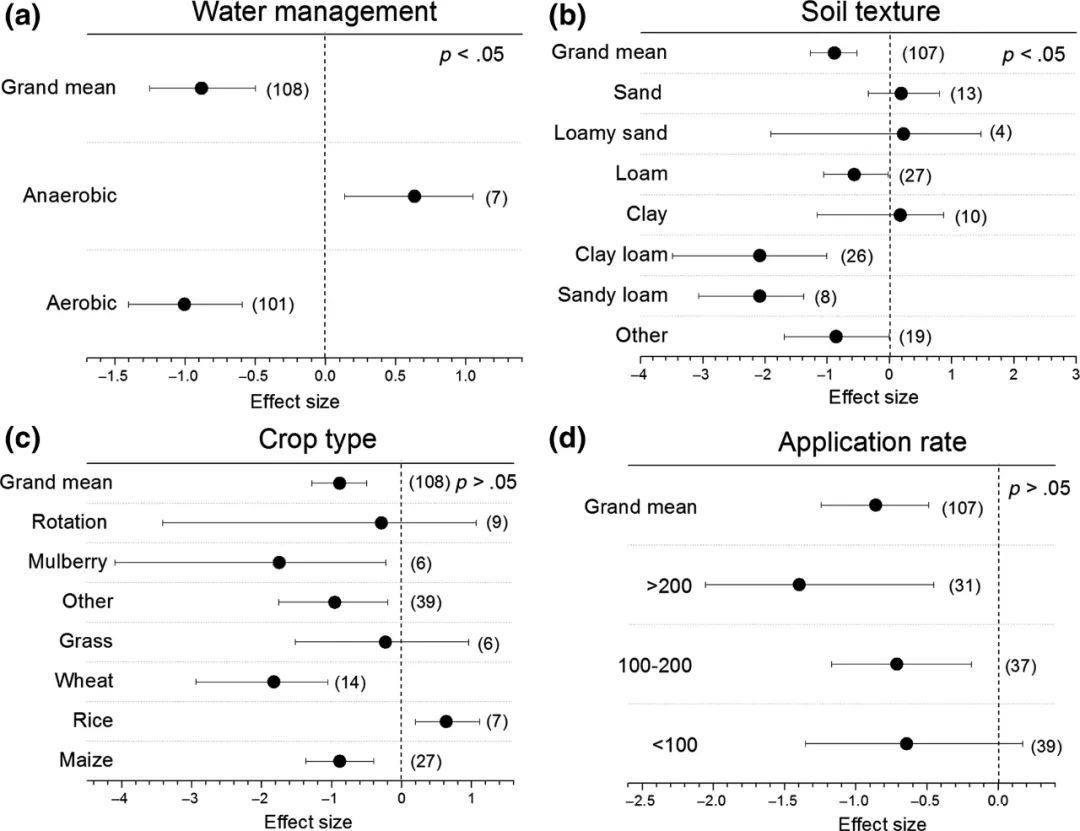 圖4分別使用(a)水分管理,(b)土壤質(zhì)地,(c)作物類型和(d)施氮量(kg N/ha)分組數(shù)據(jù)進(jìn)行分析時長期施氮對土壤細(xì)菌多樣性的影響