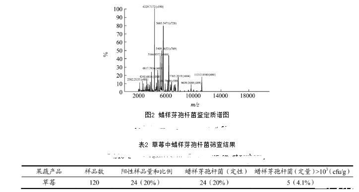 圖2蠟樣芽孢桿菌鑒定質譜圖 表2草莓中蠟樣芽孢桿菌篩查結果