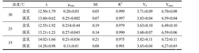 如表3所示,建立模型的回歸系數(R2)在0.972~0.999,標準誤差(SE)在0.05~0.21間,說明此模型對實驗數據的擬合度較好。膜裝草莓的微生物的回歸系數較高,標準誤差也較盒裝的低,可能因為膜裝較盒裝透氣性較差,草莓呼吸作用產生的水分沒有被空氣流通帶走,水分活度保持一個很高的水平,且相對環境較封閉,其生長曲線擬合后更符合Baranyi的數學模型。