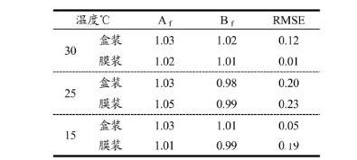 Af代表了每一個預測值的點與等值線之間的平均距離,可以衡量預測值和觀測值之間的接近程度,本實驗中Af分布在1.01~1.05之間,表示模型的穩定性較高,B f用來判斷預測值在等值線的上方還是下方以及評價預測值偏離等值線的程度,本實驗中Bf分布在0.98~1.02之間,當Bf>1說明該模型為有效保護模型,在25℃,建立模型為保護性模型,30℃是預測偏差向下,但總體偏差較小。RMSE值一般用來驗證預測模型的離散程度,實驗中RMSE在0.01~0.23表明實測數據和預測模型數據離散程度相對較小,整體體現模型可接受。