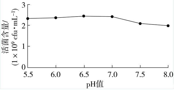 由圖6可知,當pH在5.5~6.5之間,菌株BC80-6的活菌含量隨pH的增大而增大。當pH為6.5時,活菌含量達到最大,為2.44×109 cfu/mL。當pH在6.5~8.0之間,隨著pH的增大,菌株BC80-6的活菌含量明顯下降。因此,培養液的pH應控制在6.5左右。