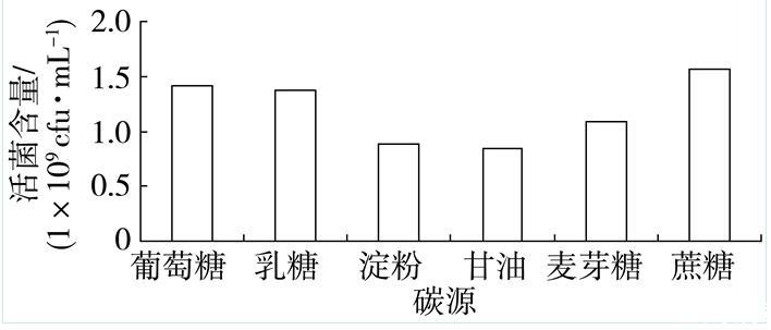 由圖1可知,菌株BC80-6在不同碳源培養基中均可生長。其中,在蔗糖為碳源的培養基中,菌株BC80-6的活菌含量最高,為1.58×109 cfu·mL-1;葡萄糖和乳糖次之,其活菌含量分別為1.42×109和1.39×109 cfu·mL-1。因此,菌株BC80-6生長的最佳碳源是蔗糖,其次是葡萄糖。