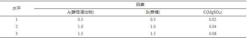由2.2節結果可知,最佳碳源、氮源、無機鹽的種類分別是:蔗糖、酵母浸出物、MgSO4。蔗糖、酵母浸出物、MgSO4各設3個含量水平,進行正交試驗(表2)。