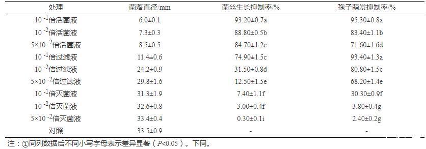 3種枯草芽孢桿菌BC80-6處理液對煙草根黑腐病菌孢子的萌發均具有抑制作用(表1)。其中,活菌液和過濾液對煙草根黑腐病菌孢子的萌發均具有較好的抑制作用,10-1倍的活菌液和過濾液對孢子萌發的抑制率分別為95.3%、93.4%。隨稀釋倍數的增加,活菌液和過濾液對孢子萌發的抑制率逐漸降低,且不同稀釋倍數之間差異顯著。滅菌液的抑制效果最差,10-1、10-2、5×10-2倍的滅菌液對孢子萌發的抑制率為30.3%、3.8%和2.4%。