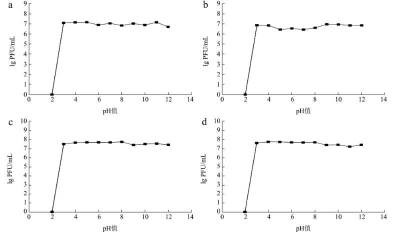 如圖5所示,噬菌體SAPYZU-04、SAPYZU-15、SAPYZU-SapM13和SAPYZU-SapM14在酸度較高的環境(pH值為2)中會完全失活;在pH值為3~12時活性較穩定。在pH值為5時,噬菌體SAPYZU-04的效價最高為1.31×107PFU/mL(P<0.05);pH值為9時,噬菌體SAPYZU-15的效價最高為8.94×106PFU/mL;而噬菌體SAPYZU-SapM13和SAPYZU-SapM14在pH值為8時效價最高,分別為9.18×107PFU/mL和9.52×107PFU/mL。結果表明噬菌體SAPYZU-04、SAPYZU-15、SAPYZU-SapM13和SAPYZU-SapM14在pH值為3~12范圍內均保持良好活性,其對酸堿的耐受能力均強于盧瑋等分離的金葡菌噬菌體(pH值為6~11范圍內穩定)。