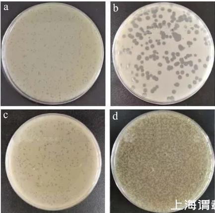 如圖1,本研究以金葡菌ATCC 29213為宿主菌,通過雙層平板法,從揚州市內污水樣品中分離得2株SA烈性噬菌體,分別命名為SAPYZU-04和SAPYZU-15。利用絲裂霉素C從已分離純化的金葡菌YZUsa13和YZUsa14中誘導出2株溫和噬菌體,分別命名為SAPYZU-SapM13和SAPYZU-SapM14。4株噬菌體的噬菌斑均呈圓形透亮、邊界清晰,直徑為0.8~1.5 mm。