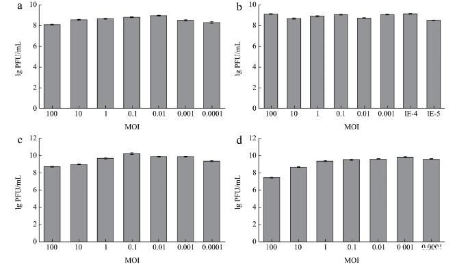 用不同MOI比例的噬菌體SAPYZU-04、SAPYZU-15、SAPYZU-SapM13和SAPYZU-SapM14感染宿主菌,培養8 h后測定噬菌體效價。如圖3所示,噬菌體SAPYZU-04在MOI為0.01(P<0.05)時,效價最高(約為109PFU/mL);噬菌體SAPYZU-15在MOI為0.000 1時,效價最高(約為1010PFU/mL);噬菌體SAPYZU-SapM13在MOI為0.1時,效價最高(約為1010PFU/mL);噬菌體SAPYZU-SapM14在MOI為0.01(P<0.01)時,效價最高(約為109PFU/mL)。因此,噬菌體SAPYZU-04、SAPYZU-15、SAPYZU-SapM13和SAPYZU-SapM14的最佳MOI分別為0.01、0.000 1、0.1和0.01。