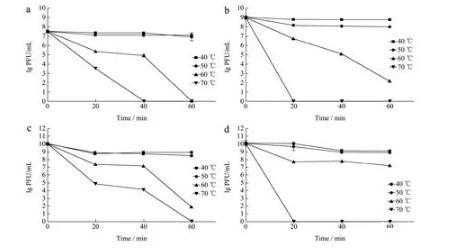 如圖4所示,金黃色葡萄球菌噬菌體SAPYZU-04、SAPYZU-15、SAPYZU-SapM13和SAPYZU-SapM14在40℃和50℃條件下作用1 h效價基本不變,效價分別為5.63×107、1.34×109、1.12×109和1.27×1010PFU/mL;在60℃條件下隨著作用時間越長,噬菌體SAPYZU-04、SAPYZU-15、SAPYZU-SapM13和SAPYZU-SapM14效價越低。分別在70℃孵育40、20和20 min時,噬菌體SAPYZU-04、SAPYZU-15和SAPYZU-SapM14完全失活,而噬菌體SAPYZU-SapM13在70℃孵育60 min時完全失活。結果表明4株噬菌體SAPYZU-04、SAPYZU-15、SAPYZU-SapM13和SAPYZU-SapM14對高溫的耐受能力均強于Kraushaar等報道的金葡菌噬菌體。