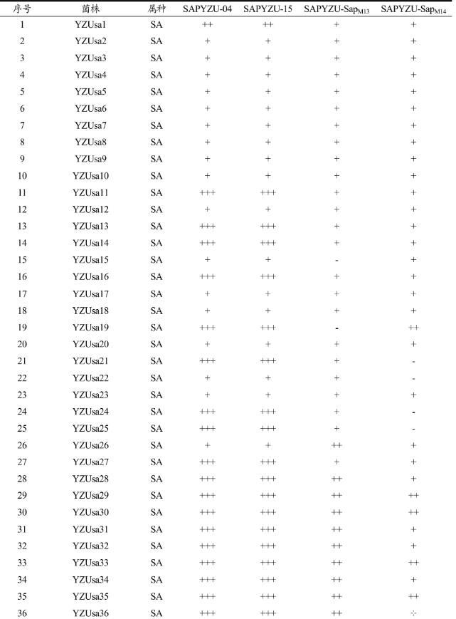 應用空斑法測試噬菌體SAPYZU-04、SAPYZU-15、SAPYZU-SapM13和SAPYZU-SapM14對51株金葡菌菌株YZUsa1-YZUsa47、ATCC 29213、MRSA 85/2082、MRSA JCSC4744、MRSA WZ153和5株其他菌屬菌株的裂解特性,結果如表1所示。烈性噬菌體SAPYZU-04和SAPYZU-15均能裂解51株金葡菌,裂解率為100%,并且噬菌斑較透亮,+++數量均達到56%;而噬菌體SAPYZU-SapM13能裂解48株SA菌株,裂解率為94%,噬菌體SAPYZU-SapM14能裂解44株SA菌株,裂解率為86%。然而,這4株噬菌體對于單核增生性李斯特菌ATCC 1911、腸炎沙門氏菌CICC 21513、大腸桿菌CICC 10664、最小弧菌CICC21613以及霍氏腸桿菌Eh-YZU05均沒有裂解能力。4株噬菌體SAPYZU-04、SAPYZU-15、SAPYZU-SapM13和SAPYZU-SapM14均比王一帆等(1/11,9%)、Yang等(13/30,43%)、黨瑞瑩等(23/63,36%)、Feng等(61/138,44%)和張志宏等(10/37,27%)分離的噬菌體的裂解譜更寬。噬菌體較寬的宿主譜是其用于生物防治的重要特性,因此,噬菌體裂解譜的測定對于選擇應用于食品中的生物抑菌劑至關重要。此外,溫和噬菌體SAPYZU-SapM13和SAPYZU-SapM14在進行宿主譜測定實驗時,對他們的溶原菌仍有裂解作用,該結果與Zhang等和Feng等的研究一致。研究表明一些噬菌體裂解宿主菌是一種“從外裂解”的過程,這個過程是高濃度噬菌體吸附宿主菌后快速破壞宿主細菌細胞。因此,本研究的溫和噬菌體SAPYZU-SapM13和SAPYZU-SapM14進行宿主譜測定時濃度遠大于宿主細菌細胞是其顯示裂解特性的原因之一。