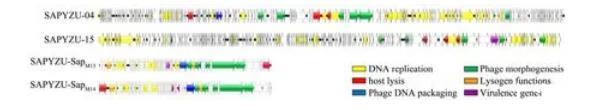 全基因組序列分析結(jié)果顯示烈性噬菌體SAPYZU-04和SAPYZU-15基因組全長分別為140 584 bp和135 178 bp,而溫和噬菌體SAPYZU-SapM13和SAPYZU-SapM14的基因組全長分別為44 922 bp和44 232 bp。其中噬菌體SAPYZU-04的GC含量為31.48%,預(yù)測到188個ORFs;噬菌體SAPYZU-15的GC含量為29.90%,預(yù)測到187個ORFs;噬菌體SAPYZU-SapM13的GC含量為33.98%,包含71個ORFs;噬菌體SAPYZU-SapM14的GC含量為33.89%,包括73個ORFs。