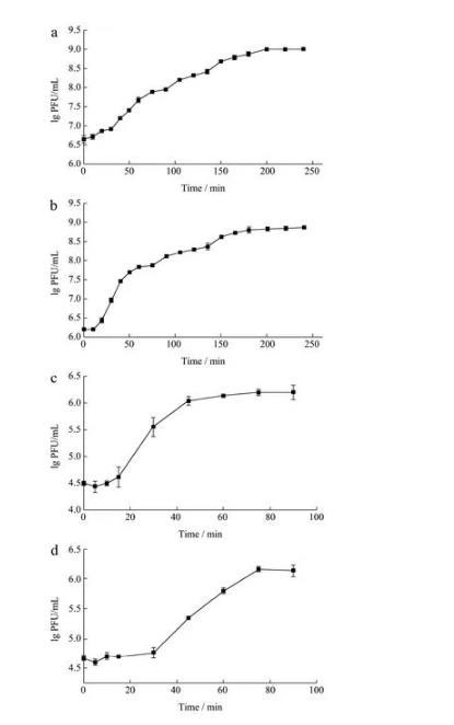 將噬菌體SAPYZU-04、SAPYZU-15、SAPYZU-SapM13和SAPYZU-SapM14分別與宿主菌混合后培養(yǎng),得到噬菌體的一步生長曲線。如圖6所示,烈性噬菌體SAPYZU-04和SAPYZU-15侵染宿主的10 min內(nèi)效價無明顯變化,表明它們的潛伏期均為10 min。在10~150 min內(nèi),噬菌體SAPYZU-04和SAPYZU-15的效價一直保持升高趨勢,隨后趨于穩(wěn)定,表明它們的裂解期均約為140 min,裂解量分別約為每個細(xì)胞210和322 PFU。而溫和噬菌體SAPYZU-SapM13和SAPYZU-SapM14的潛伏期較長,分別約為15和30 min;裂解期較短,分別約為30和45 min,裂解量分別為每個細(xì)胞52和49 PFU。上述結(jié)果顯示,烈性噬菌體SAPYZU-04和SAPYZU-15的裂解量均高于Gutierrez等分離的金葡菌烈性噬菌體(每個細(xì)胞15和25 PFU)。溫和噬菌體SAPYZU-SapM13和SAPYZU-SapM14的裂解量比Feng等分離的溫和噬菌體JD419裂解量(每個細(xì)胞33 PFU)更高。潛伏期和爆發(fā)量是表示噬菌體裂解能力的重要生物學(xué)特性,具有較短潛伏期和較大爆發(fā)量的噬菌體更適合作為生物防治劑。