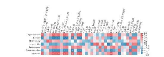 為了進一步了解黃豆醬發酵過程中微生物與揮發性風味物質之間的關系,通過對優勢微生物和揮發性風味物質數據進行同理化處理和相關性分析,結果如圖2所示。
